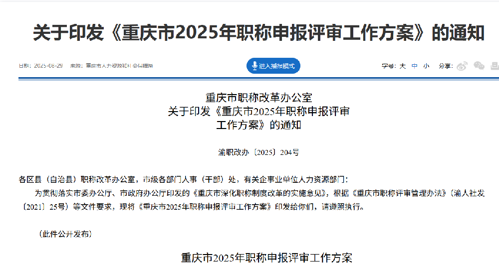《重慶市2025年職稱申報(bào)評(píng)審工作方案》的通知?渝職改辦〔2025〕204號(hào)文件···